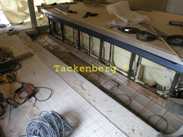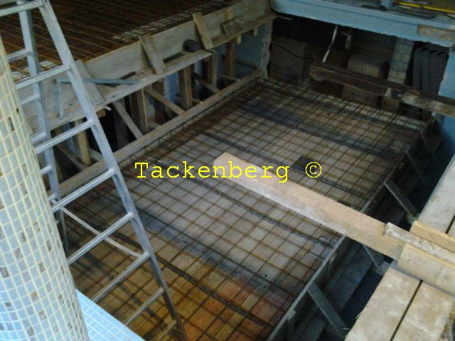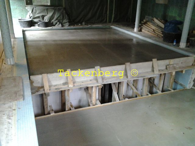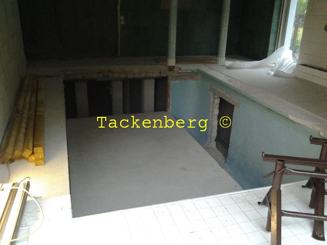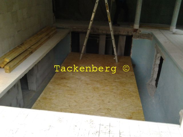 Als Unterlage kommt eine OSB-Platte auf das Fundament um die Schwingungen abzufangen. Der Restbereich des altes Schwimmbades kann abgemauert werden und der dadurch entstehende Raum kann einer neuen Nutzung zugeführt werden.