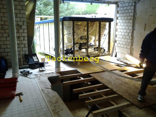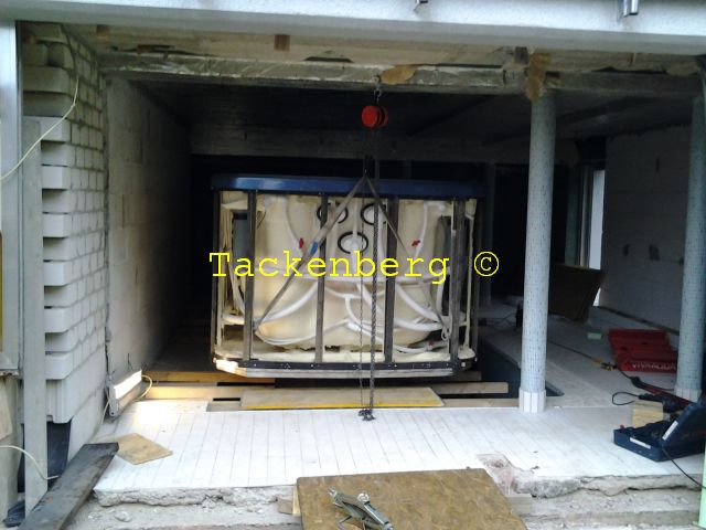 Der für die Bodenplatte nicht benötigte Teil der ehemaligen Schwimmbadfläche wird von einem Rohbauer ausgeschalt. Hier empfiehlt sich eine verlorene Schalung. Das Schwimmbecken kann, obwohl es ursprünglich als Aufstellbecken geplant war, in die vorhandene Öffnung eingebaut werden. Obwohl er nur eine Wasserhöhe von ca. 1,2 m und eine daraus resultierende Gesamtbauhöhe von ca. 1,5 m hat, kann er bei Vorhandensein einer entsprechenden Öffnung in diese eingebaut werden. Dies hat den Vorteil, dass man auch im Sitzen sehr gut in den Whirlpool einsteigen kann.